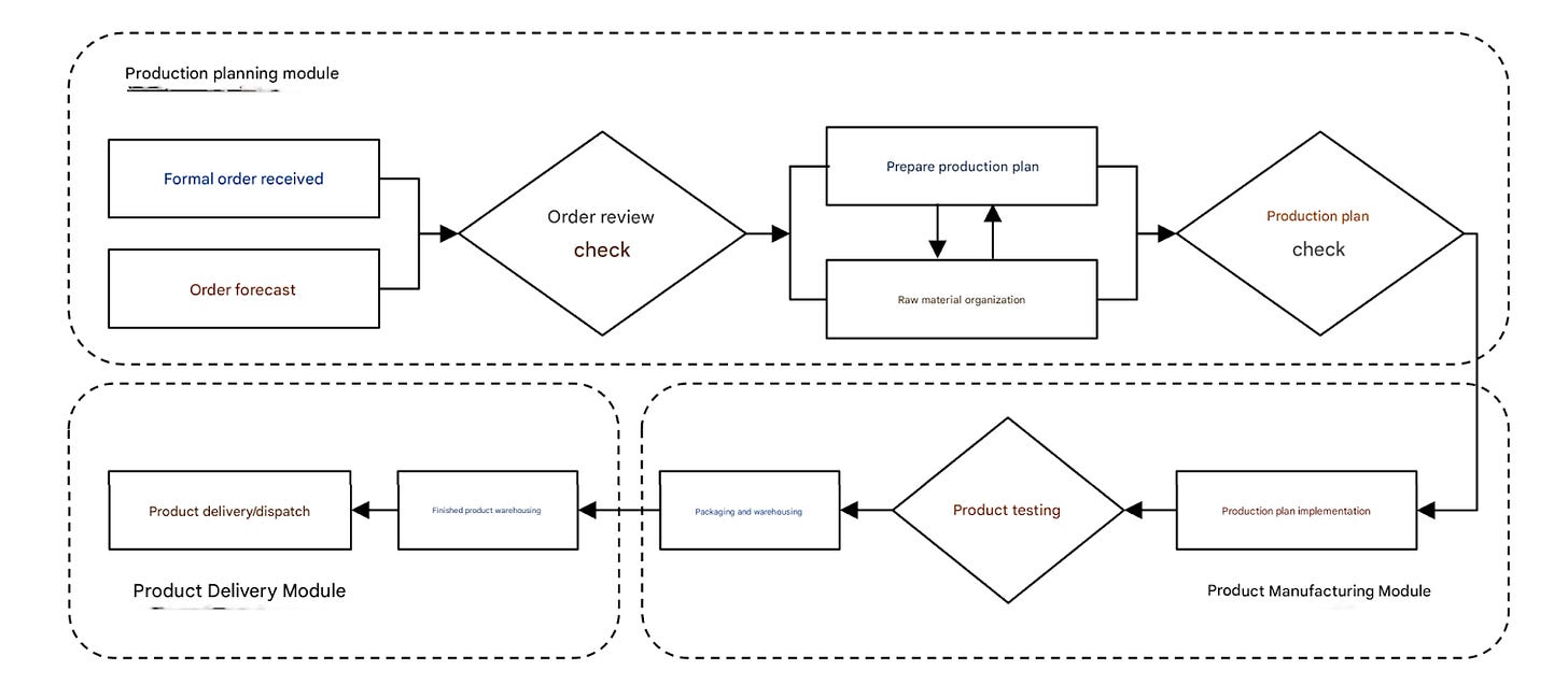The company’s production model primarily relies on order-based manufacturing according to customer customization needs. All production is conducted in-house, comprising three modules: production planning, product manufacturing, and product delivery. The company typically establishes different production lines and areas based on production processes, batch sizes, environmental considerations, and specific customer or consumer requirements. These include mass production lines and large-customer product lines, effectively avoiding time wasted on product model changes, improving production line uptime, and meeting the diverse needs of different customers for dedicated production lines.