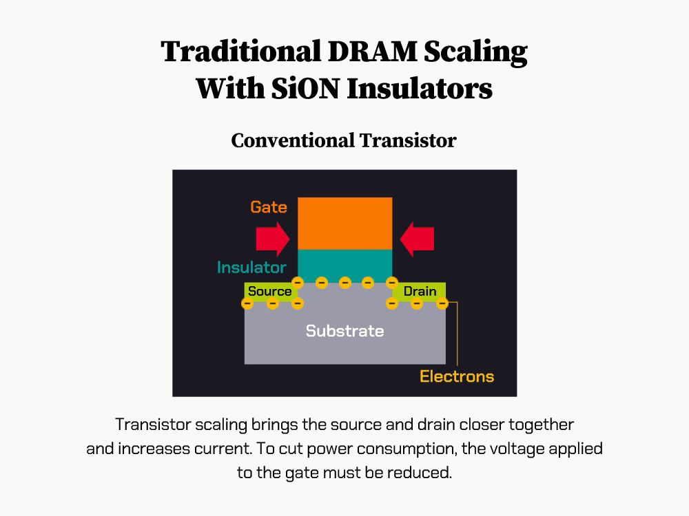 As shown below, periphery transistors on a DRAM die are normally advanced by shrinking distances between the source and drain while also thinning the gate insulator. However, when insulator thinness reaches its limit, leakage issues emerge, and HKMG is used to solve them.