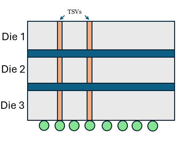 Another step in DRAM manufacturing for HBM is the formation of through-silicon vias (TSVs), diagrammed below. This front-end-of-the-line process forms the vertical connections that allow stacked DRAM dies to communicate and function together. Without TSVs, the concept of HBM and of nearly all advanced packaging would be impossible.