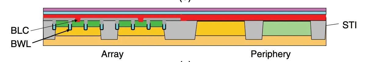 As shown above, patterning and etching the BLC must thread the needle so as to contact the source/drain of the array transistors rather than the buried wordline (BWL) shown in teal.
