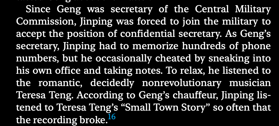 “Yang was surprised to find Xi drinking strong cheap liquor and crying alone in the dark. Xi explained that it was his son Jinping’s birthday. Xi said, ‘Your father is better than I am; he took such good care of you. I am also a father, but because of me . . . Jinping only narrowly escaped death!’ Xi then proceeded to tell Yang about Jinping’s experiences during the Cultural Revolution. Yang later wrote, ‘That night, Old Xi spoke to me, and at the same time, he cried. He kept saying he had let down everyone in his family. He said that in terms of taking care of his entire family, his behavior had been criminal and so on. One could say that his emotional state was approaching a total lack of control. It made me feel extremely sad. Normally, his words would be very concise. He wasn’t verbose, and he didn’t repeat himself. He definitely was never incoherent.’”
